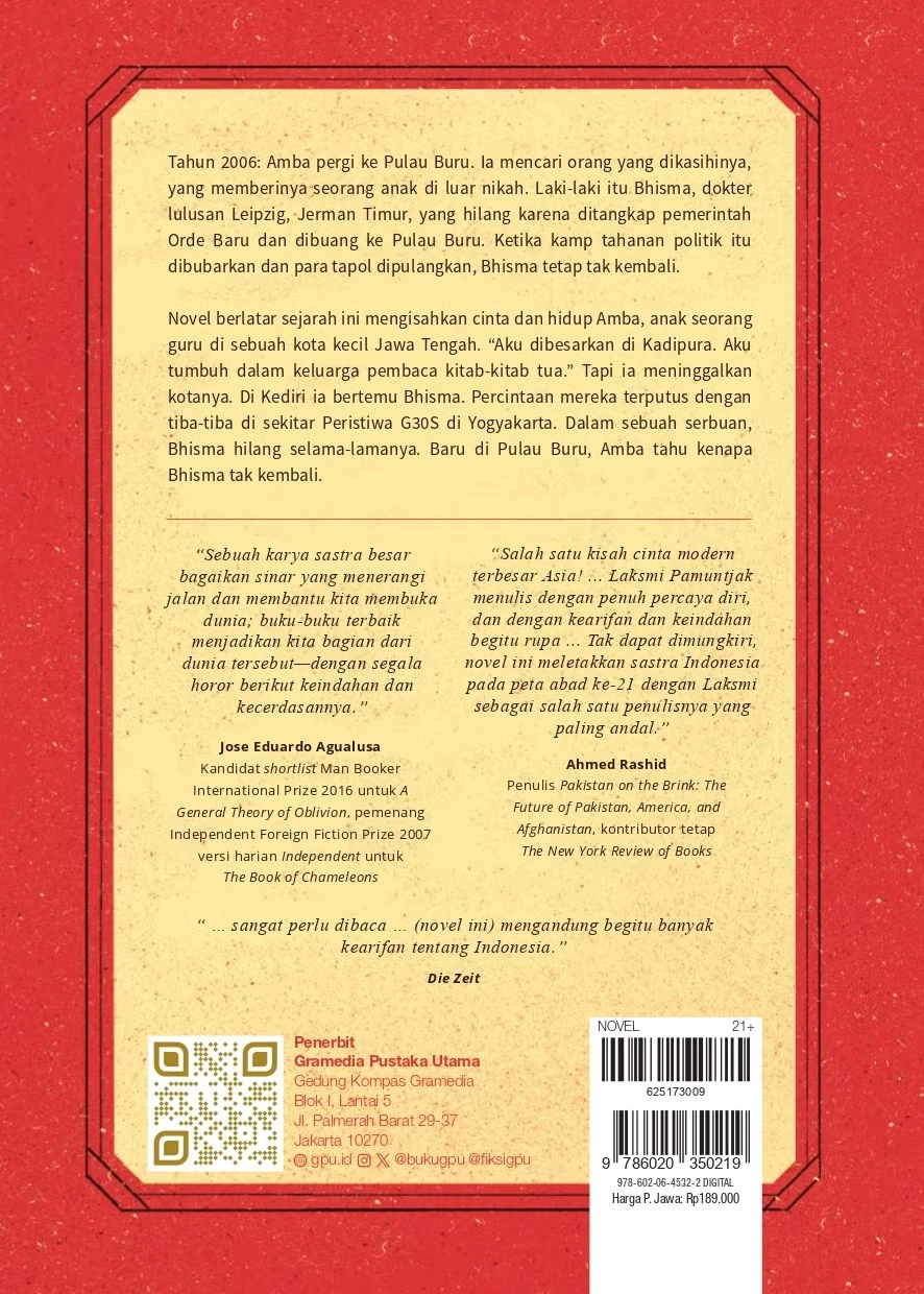 Novel berlatar sejarah ini mengisahkan cinta dan hidup Amba, anak seorang guru di sebuah kota kecil Jawa Tengah. “Aku dibesarkan di Kadipura. Aku tumbuh dalam keluarga pembaca kitab-kitab tua.” Tapi ia meninggalkan kotanya. Di Kediri ia bertemu Bhisma. Percintaan mereka terputus dengan tiba-tiba di sekitar Peristiwa G30S di Yogyakarta. Dalam sebuah serbuan, Bhisma hilang selama-lamanya. Baru di Pulau Buru, Amba tahu kenapa Bhisma tak kembali.