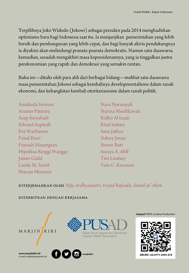 Buku ini—ditulis oleh para ahli dari berbagai bidang—melihat satu dasawarsa masa pemerintahan Jokowi sebagai kembalinya developmentalisme dalam ranah ekonomi, dan kebangkitan kembali otoritarianisme dalam ranah politik.