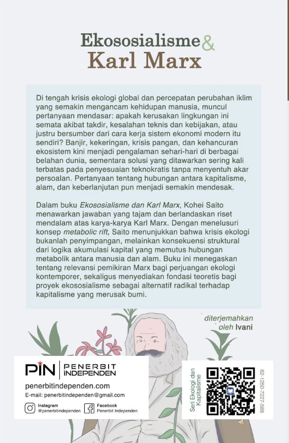 Dalam buku Ekososialisme dan Karl Marx, Kohei Saito menawarkan jawaban yang tajam dan berlandaskan riset mendalam atas karya-karya Karl Marx. Dengan menelusuri konsep metabolic rift, Saito menunjukkan bahwa krisis ekologi bukanlah penyimpangan, melainkan konsekuensi struktural dari logika akumulasi kapital yang memutus hubungan metabolik antara manusia dan alam. Buku ini menegaskan tentang relevansi pemikiran Marx bagi perjuangan ekologi kontemporer, sekaligus menyediakan fondasi teoretis bagi proyek ekososialisme sebagai alternatif radikal terhadap kapitalisme yang merusak bumi.