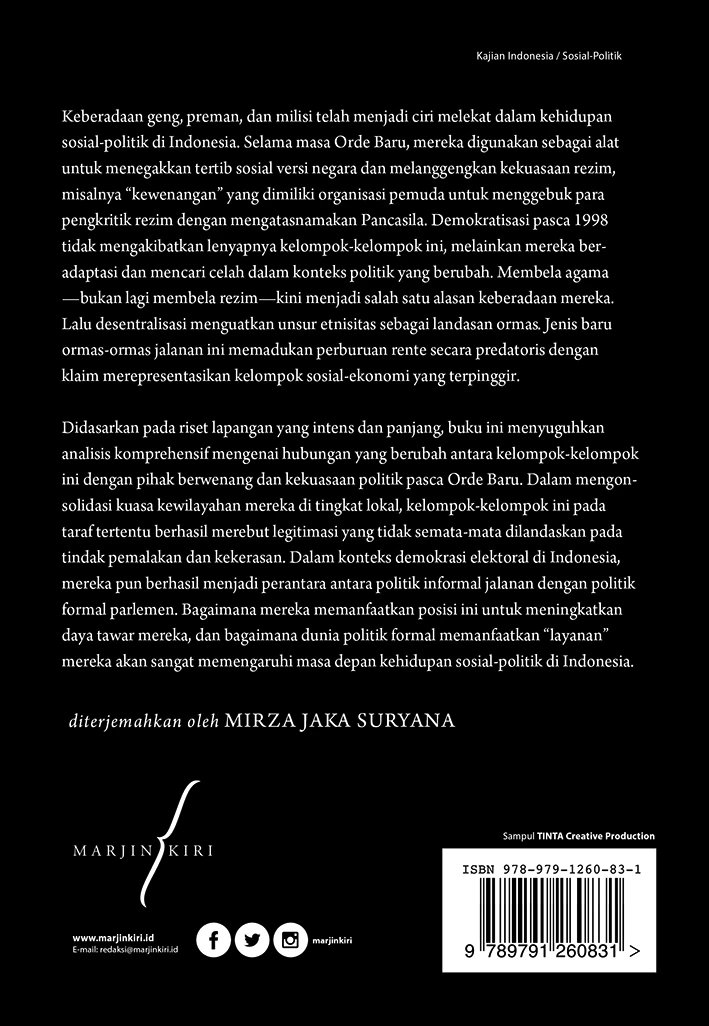 Didasarkan pada riset lapangan yang intens dan panjang, buku ini menyuguhkan analisis komprehensif mengenai hubungan yang berubah antara kelompok-kelompok ini dengan pihak berwenang dan kekuasaan politik pasca Orde Baru. Dalam mengonsolidasi kuasa kewilayahan mereka di tingkat lokal, kelompok-kelompok ini pada taraf tertentu berhasil merebut legitimasi yang tidak semata-mata dilandaskan pada tindak pemalakan dan kekerasan. Dalam konteks demokrasi elektoral di Indonesia, mereka pun berhasil menjadi perantara antara politik informal jalanan dengan politik formal parlemen. Bagaimana mereka memanfaatkan posisi ini untuk meningkatkan daya tawar mereka, dan bagaimana dunia politik formal memanfaatkan “layanan” mereka akan sangat memengaruhi masa depan kehidupan sosial-politik di Indonesia.